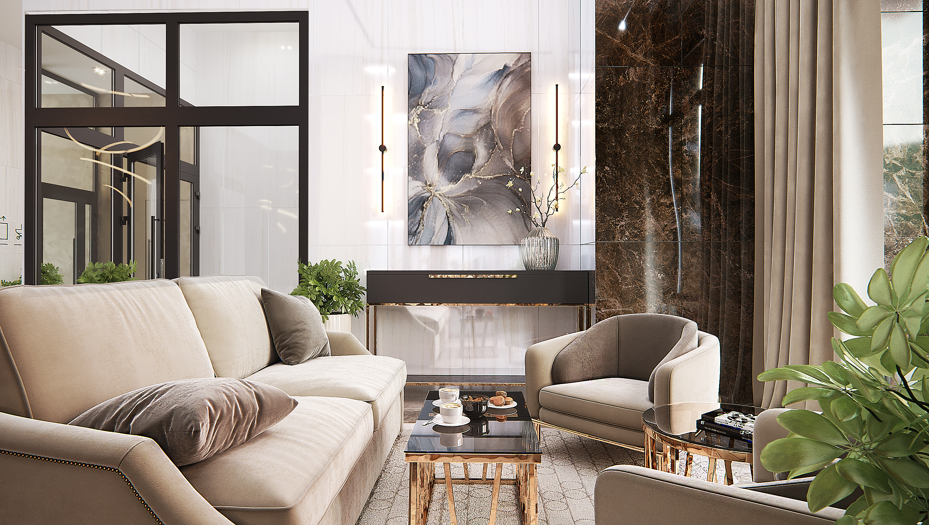 Авторский дизайн интерьеров холлов, гостевого лобби, входной группы, зоны ожидания, рецепции задают достойный уровень жилого комплекса